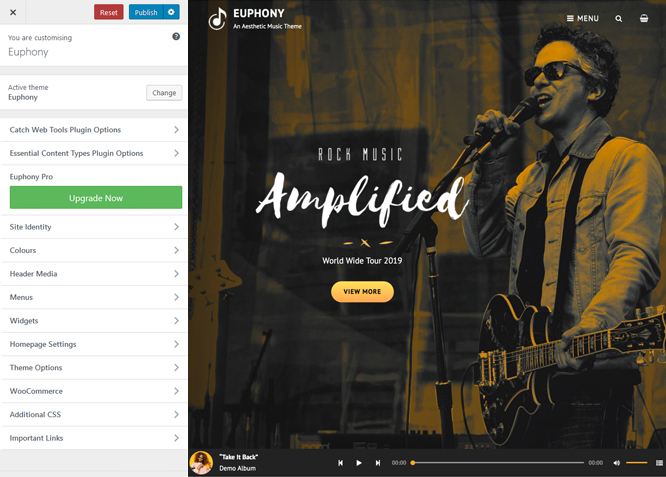 Euphony is a free music WordPress theme crafted beautifully for musicians and bands. It comes with a minimalistic, interactive and super elegant concept. Euphony has been made to be versatile within the music industry and fun to play with. This theme is power packed with astounding features like Featured Content, Featured Slider, Hero Content, Sticky Playlist, Services, Portfolio, Testimonials, and more. All of these features in Euphony allows you to tweak your music website the way you like. Euphony is an ideal solution for musicians, solo artists, bands, podcasts, music blogs; you just name it, the theme helps you realize all your ideas. The theme is completely responsive and thus compatible with all kinds of modern browsers. To top it all, the theme is translation-ready. If you want advance music features, check out the premium version, Euphony Pro.
