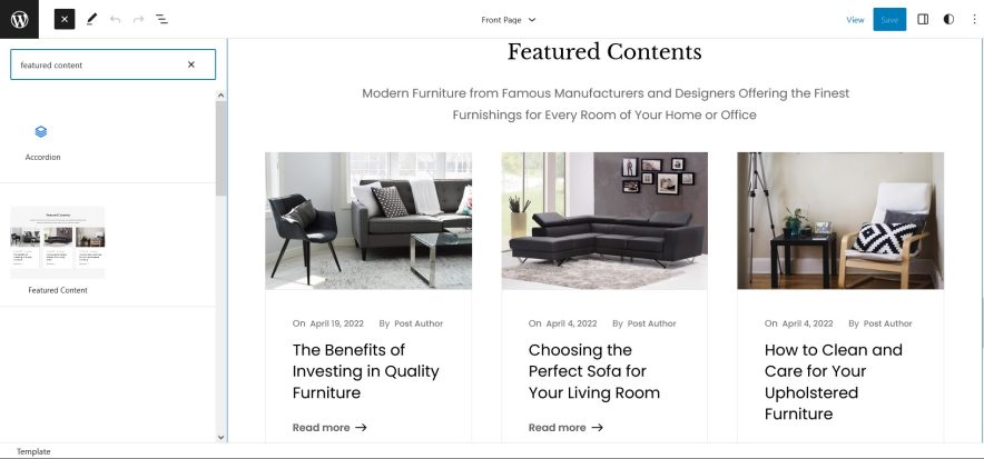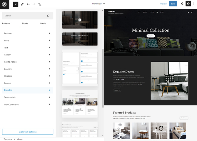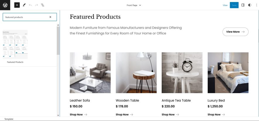 Featured Products pattern in Furnitrix is woocommerce pattern, you can add list of your featured products along with its image and price in it
