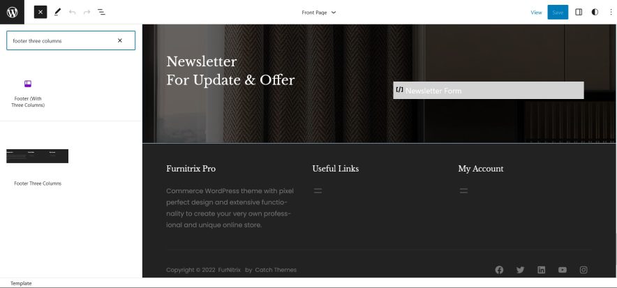 The Footer Three Columns pattern allows you to insert a section that you can display right above your default footer. In the pattern, by default, there are three columns and you can use the columns to add quick information and also your contact info including your social icons.