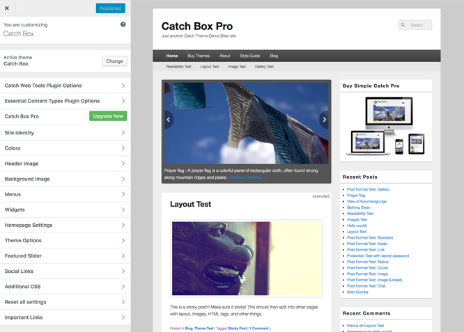 The most powerful feature of Catch Themes is its Theme Options which will allow you to easily customize your website with clicks. So, now you no longer need to be a designer or a programmer to build customized websites. Theme Options allow you to toggle on and off features, adjust layouts, change colors, fonts, logo, favicon, background, add social links and custom CSS.