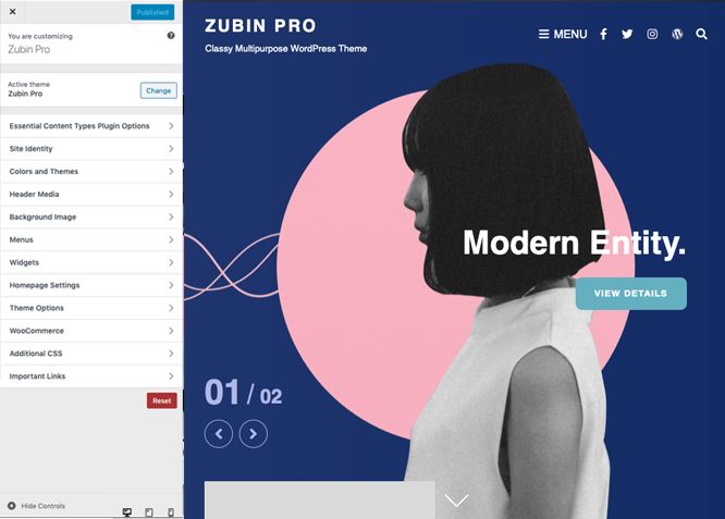 Zubin Pro supports 5 featured content types to choose from: 1. Post, 2. Page, 3. Category and 4. Custom. 5.Custom Post Type(requires Essential Content Type Plugin ). For Featured Content Options, go to “Appearance => Customize => Theme Options => Featured Content”