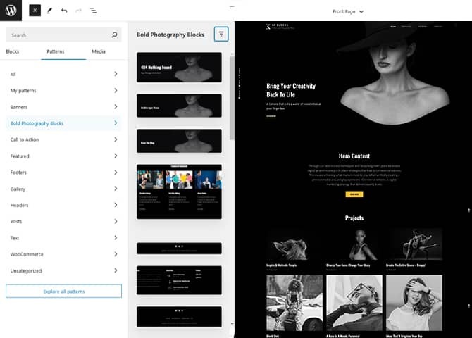 2. Click select “Bold Photography Blocks” to see list of pattern provided by Bold Photography Blocks