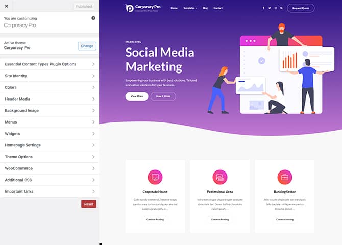 Corporacy Pro supports 5 services types including, 1. Post, 2. Page, 3. Category, 4. Custom and 5. Custom Post Types. For Services, go to “Appearance => Customize => Services”.