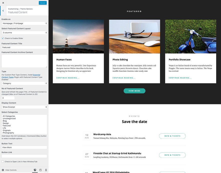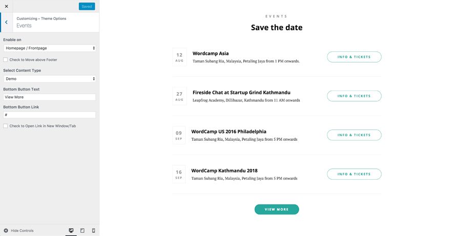 - Events: Option to choose events as Post, Page, Category or Image as events, option to enable/disable events on homepage, edit bottom button text, edit bottom button link