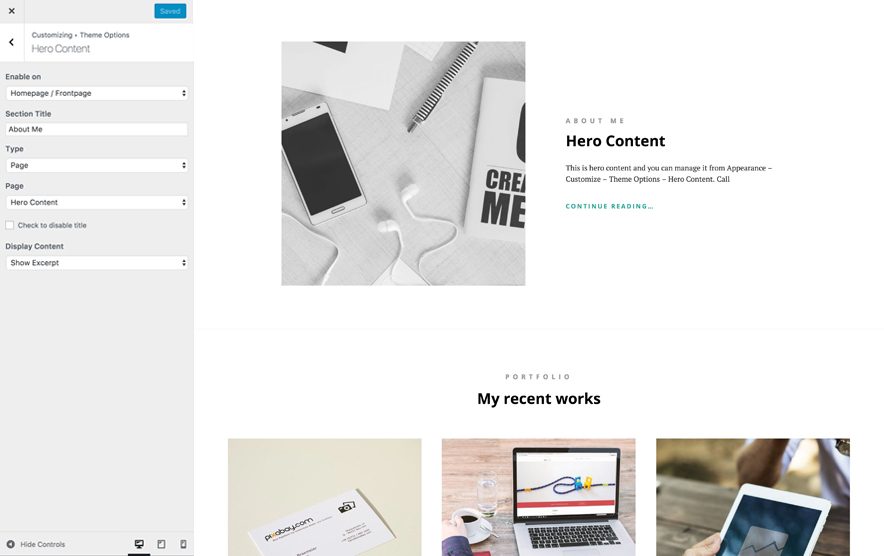- Hero Content: Option to choose Page as hero content, further option to enable/disable hero content, enable/disable title and edit display content