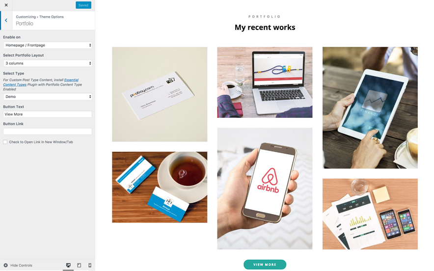 - Portfolio :Option to enable/disable Portfolio in Homepage/Frontpage and entire site. (requires Essential Content Type Plugin ).