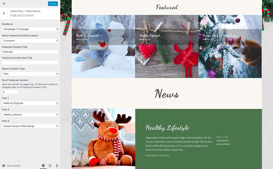 - Featured Content: Option to choose Page as featured content, option to enable/disable featured content on Homepage/Frontpage or entire site, option to select Featured Content layout from 2 columns, 3 columns or 4 columns, edit Featured Content Title and Sub Title
