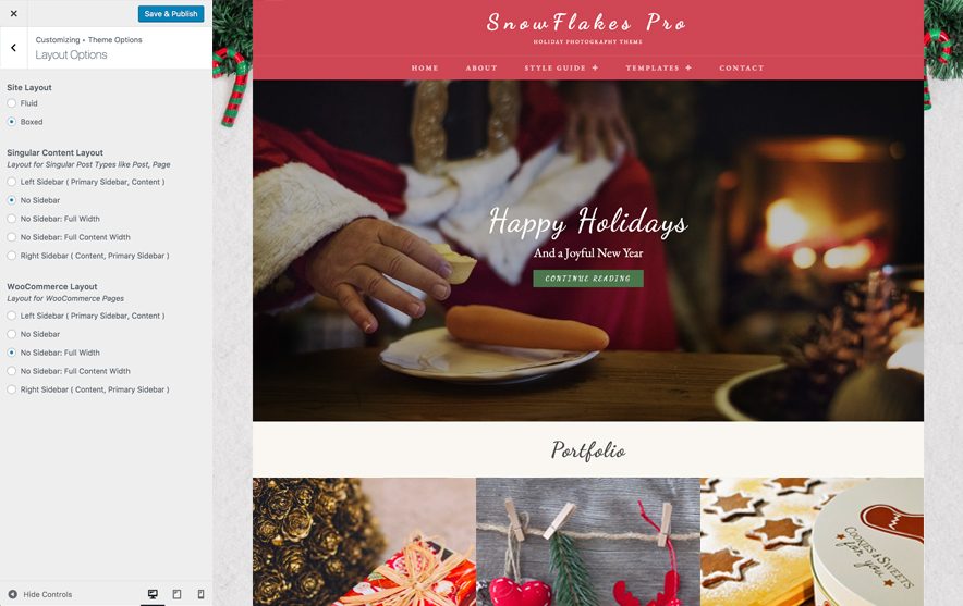 Snowflakes Pro has 2 Site Layout, 4 Singular Content Layout options and 4 Woocommerce Layout options image layout to choose from “Appearance => Customize => Theme Options => Layout Options”