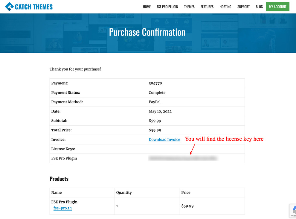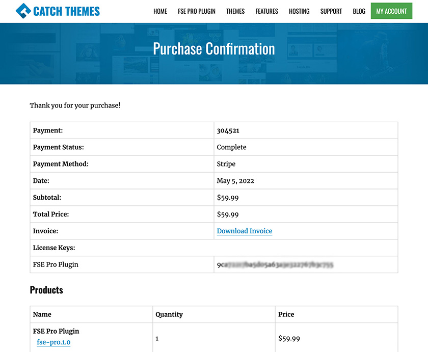 After your payment has been completed, you will see a payment completion message on thank you page and you will be automatically redirected to My Account page, where you can see your downloads, license key, and invoice.