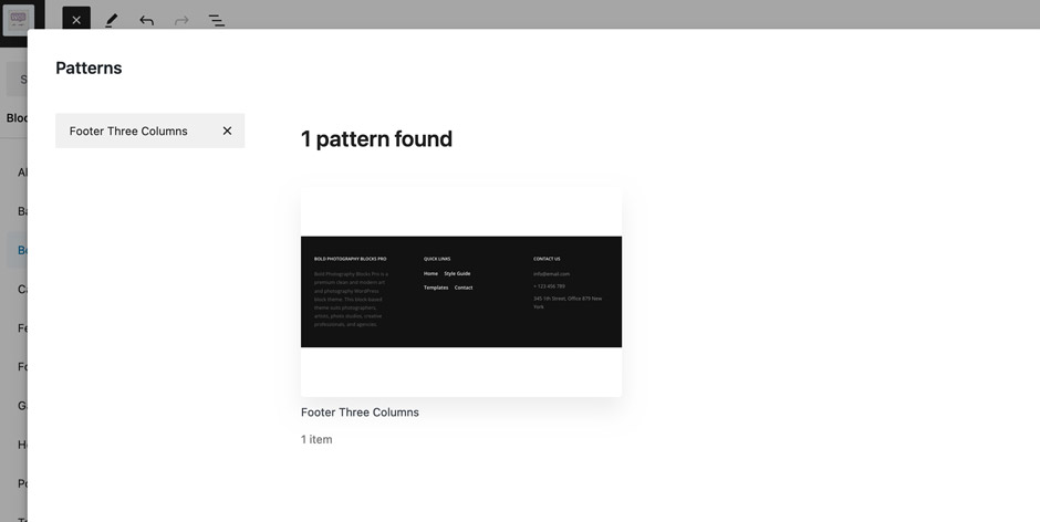You can easily add patterns in any part of your website. You will just have to click on ‘+’ sign on top left of your page or post, then you will see tab for “Pattern” click on that to see list of patterns. Under Scroll Down you will find “Bold Photography Blocks Pro” which will display list of our Bold Photography Blocks Pro pattern