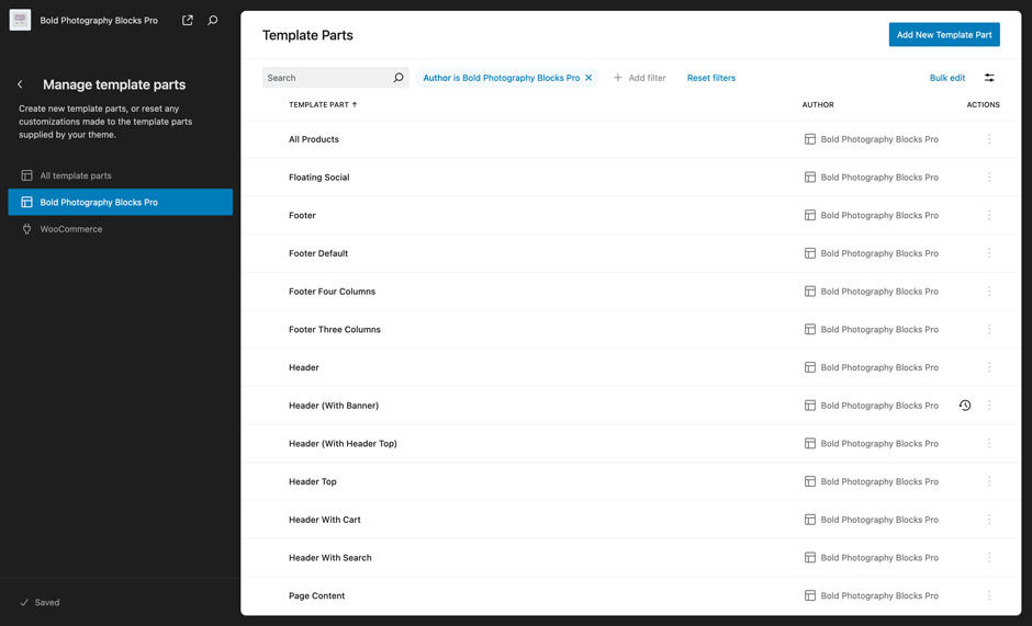 There are 16 Template Parts in Bold Photography Blocks Pro.