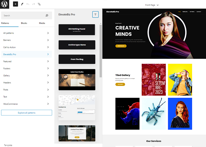 Comes with a collection of predefined block design layouts, available from the patterns tab of the block inserter. Create an elegant layout that combines different blocks. Build Gracefully!