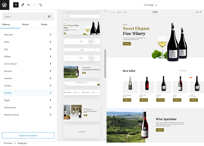 You will just have to click on ‘+’ sign on top left of your page or post, then you will see tab for “Pattern” click on that to see list of patterns. Under Scroll Down you will find “Drinkify” which will display list of our Drinkify pattern