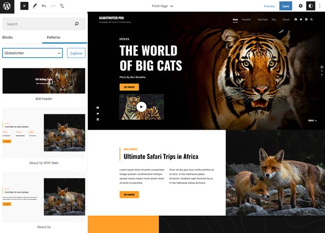 Globetrotter Pro is a premium multipurpose photography WordPress block theme for full site editing. This block-based theme comes with incredible features and an attractive design. The theme is perfect for photographers, photo bloggers, freelancers, and other photographic-centric websites. With the full site editing features, you can easily drag and drop the block patterns and customize your site. However, since it is a multipurpose theme, it can be used for various purposes like portfolios, personal blogs, and many more. The theme is specially crafted to showcase photography skills beautifully. There are 45+ block patterns, 20 Templates, and 11 Template Parts available in Globetrotter Pro. Some of the block patterns are Featured Categories, Client’s Testimonial, Grid Blog Post, About us With Stats, How It Works, Latest Products, Footer with Four Columns, Hidden 404, Header Media, CTA Just Video, Quick Contact Form, Recent Blog With Sidebar, Logo Slider, Team Slider, Sidebar, Subscribe, and many more. All of the block patterns, templates, and template parts are fully customizable, fast loading, and responsive that adapt to all screen sizes. Buy Globetrotter Pro today and showcase your photography to the world!