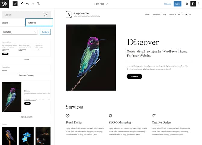 You will just have to click on ‘+’ sign on top left of your page or post, then you will see tab for “Pattern” click on that to see list of patterns. Under Scroll Down you will find “ArtsyLens Pro” which will display list of our ArtsyLens Pro pattern