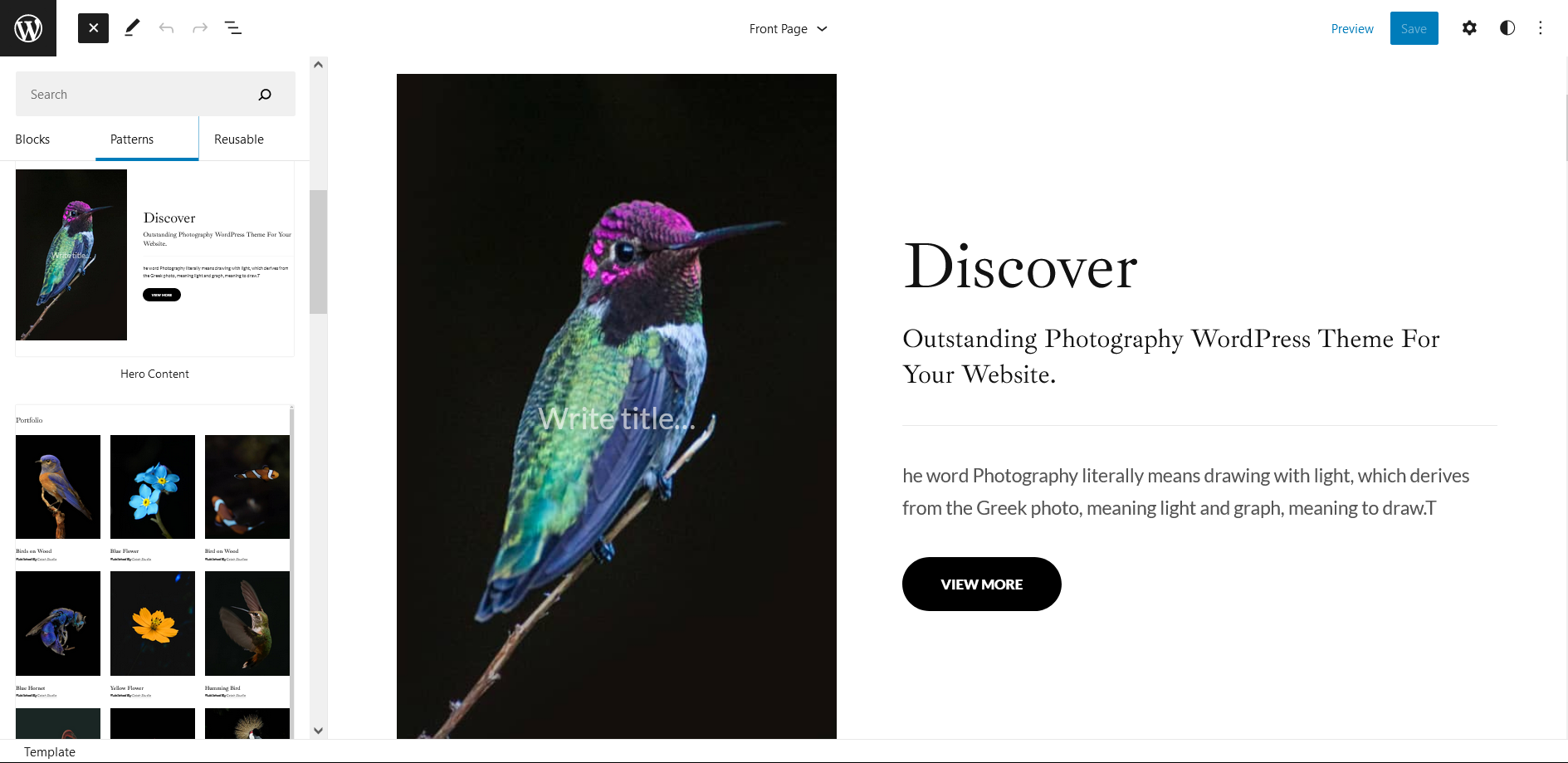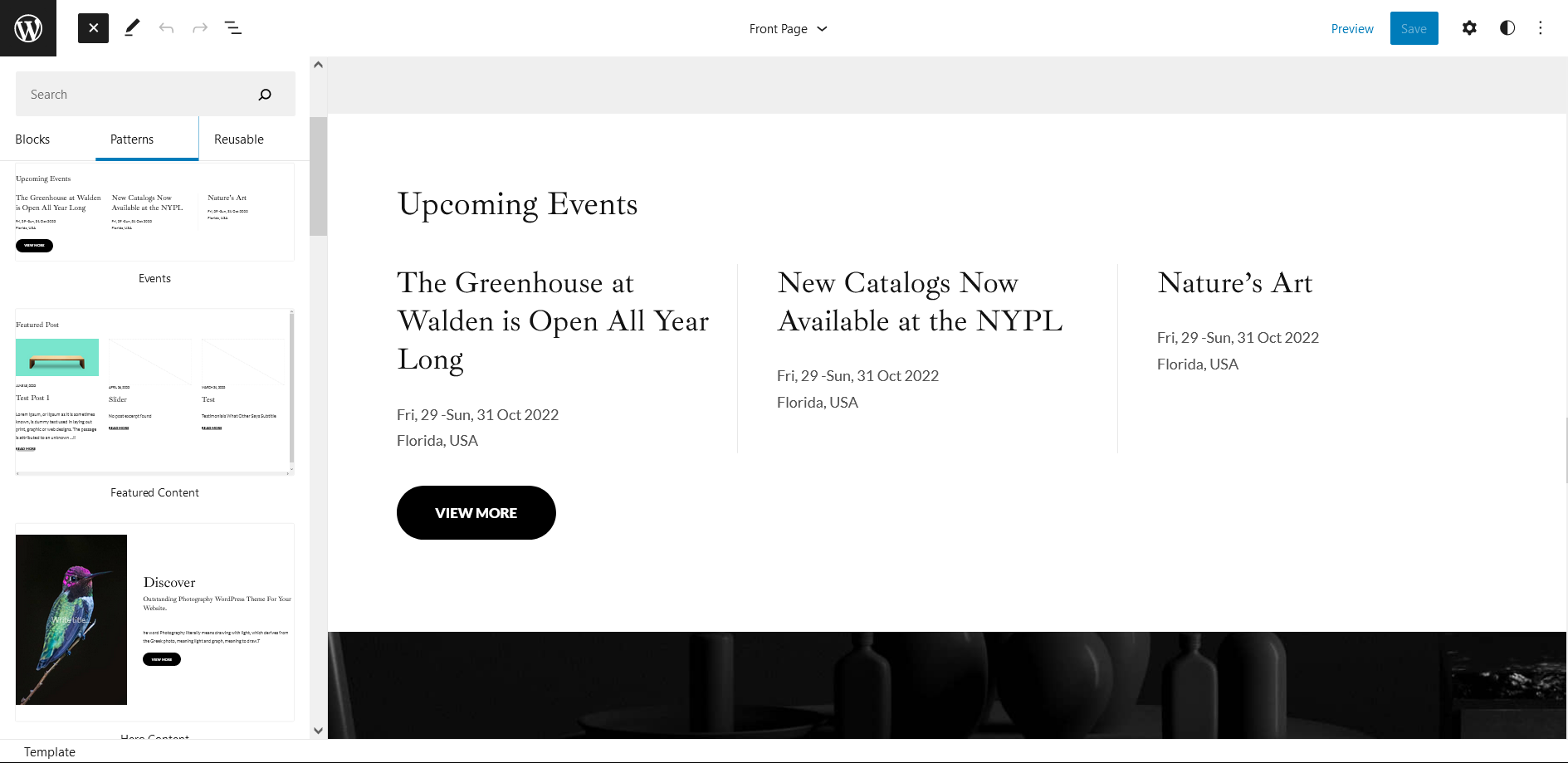 - Click on “+” sign on the top bar to display Blocks and Pattern
