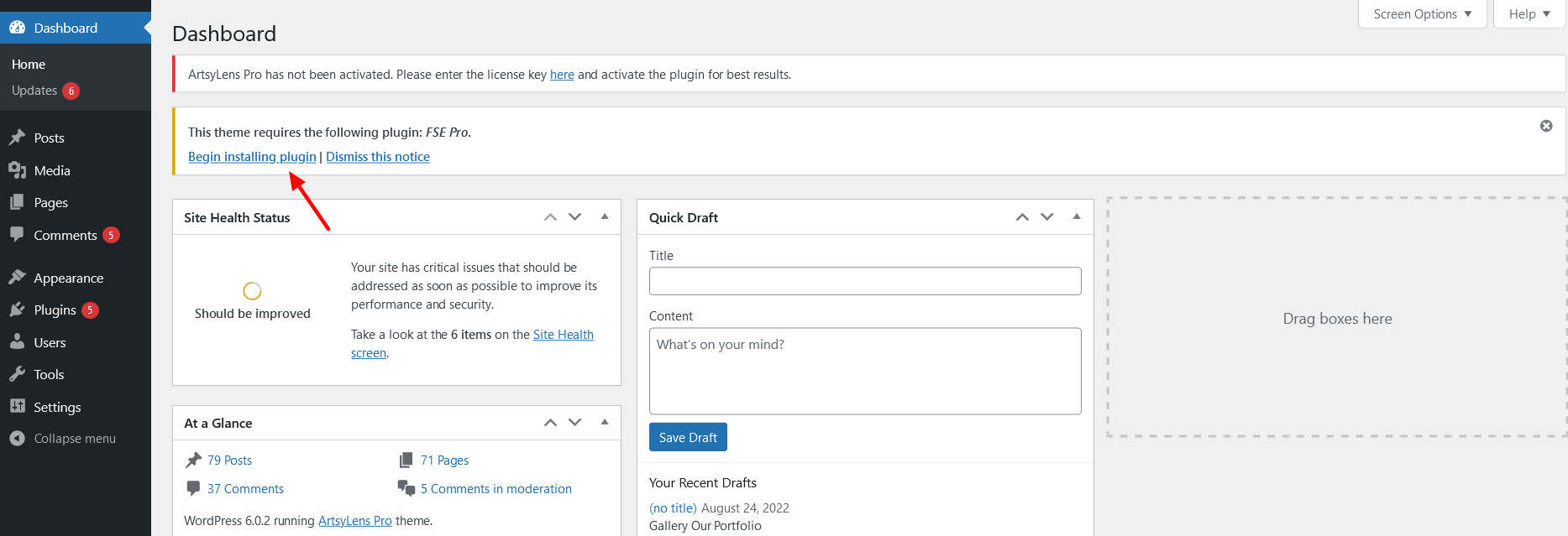 1. After installation of theme, go to WordPress Dashboard, there you will find notice “This theme requires the following plugin: FSE Pro”, click on “Begin Install Button” as shown in the picture below: