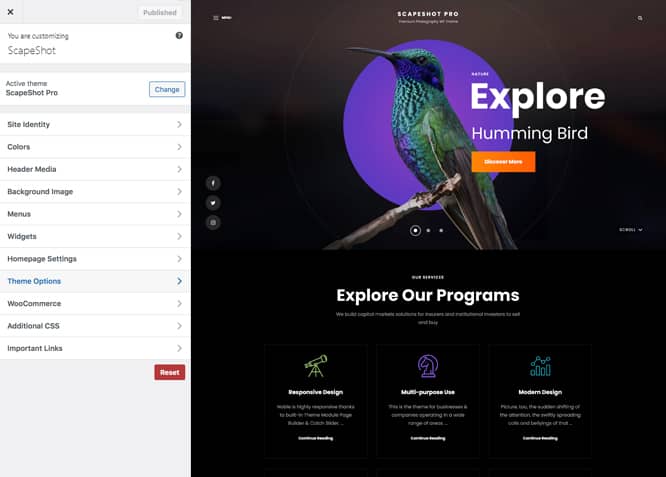 Scapeshot Pro supports 4 featured slider including, 1. Post , 2. Page, 3. Category and 4. Custom. For Featured Slider Options, go to “Appearance => Customize => Theme Options =>Featured Slider”.