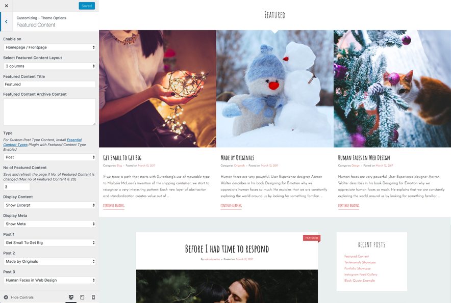 5. Featured Content: Option to select Post, Page, Category, Image, Tags(via jetpack) as Featured Content further option to enable/disable content on Entire site and Homepage/Frontpage, select featured content layout, edit Headline and Subheadline for Featured Content, select no. of featured content, Display Content, Display Meta, select multiple categories