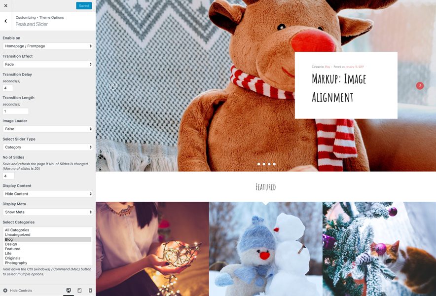 4. Featured Slider: Option to enable Featured Slider on Homepage, Entire Site or Disable it completely. Option to select featured slider from Post, Page, Category or Image.