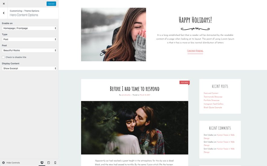 9. Hero Content Options: Option to enable/disable Hero Content in Homepage/Frontpage and entire site. Select content type as Post, Page, Category or Image. Option to display content as show excerpt, full content or hide content.