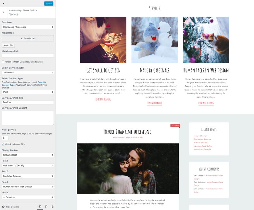 12. Services: Option to enable/disable Services in Homepage/Frontpage and entire site. Select content type as Post, Page, Category, Image and Custom Post Type (requires Essential Content Type Plugin ).