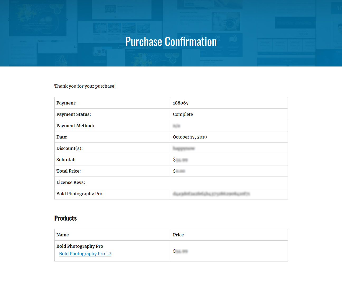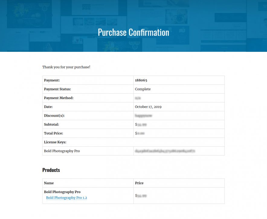 After your payment has been completed, you will see a payment completion message on thank you page and you will be automatically redirected to My Account page, where you can see your downloads, license key, and invoice.